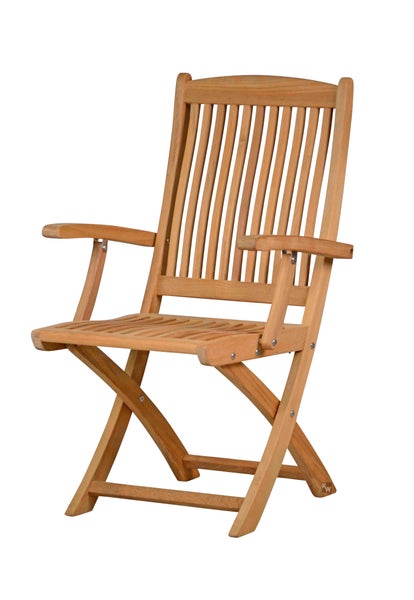Dieser massive Teak Gartenklappstuhl aus hochwertigem Plantagenteakholz besticht durch sein zurückhaltendes Design und ist besonders robust konstruiert. Teakholz bietet eine einmalig hohe Wetterbeständigkeit, sodass sich der Teak Gartenstuhl mit Klappfunktion ganzjährig für alle Gärten, Terrassen und Balkone eignet. Die ergonomisch geformte Rückenlehne und die beiden Armlehnen ermöglichen ein sehr bequemes Sitzen. Der Klappstuhl aus Teakholz wird fertig montiert geliefert und lässt sich durch einen Griff in der Sitzfläche ganz einfach zusammenklappen. Gleichzeitig verhindert ein Klappschutz das Einklemmen von Fingern, da nichts ungewollt zusammenklappt. Passend zu diesem Modell bietet Kai Wiechmann abziehbare und waschbare Sitzauflagen in verschiedenen Farben an.