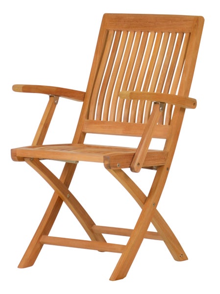 Dieser massive Teak Gartenklappstuhl aus hochwertigem Plantagenteakholz besticht durch sein zurückhaltendes Design und ist besonders robust konstruiert. Teakholz bietet eine einmalig hohe Wetterbeständigkeit, sodass sich der Teak Gartenstuhl mit Klappfunktion ganzjährig für alle Gärten, Terrassen und Balkone eignet. Die ergonomisch geformte Rückenlehne ermöglicht gemeinsam mit den Armlehnen ein sehr bequemes Sitzen. Der Klappstuhl aus Teakholz wird fertig montiert geliefert und lässt sich durch einen Griff in der Sitzfläche ganz einfach zusammenklappen. Wir empfehlen, ihn mit Teak-Tischen der Firma Kai Wiechmann zu kombinieren. Des Weiteren bietet Kai Wiechmann exakt passende, abziehbare und waschbare Sitzauflagen in verschiedenen Farben an.