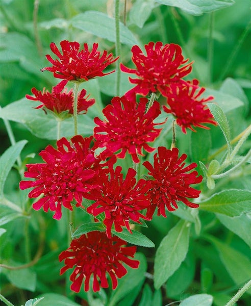 Knautia macedonica, die Mazedonische Witwenblume, ist eine elegante, langblühende Staude, die mit zahllosen weinroten, kissenartigen Blütenköpfen begeistert. Von Frühsommer bis in den Herbst erscheinen an schlanken, verzweigten Stielen unermüdlich neue Blüten, die über dem lockeren, graugrünen, fein gelappten Laub zu schweben scheinen. Der Wuchs ist aufrecht und locker-buschig, dabei standfest und natürlichen Anmutungen verpflichtet, womit diese Blütenstaude sowohl im Bauerngarten als auch in modernen Präriebeeten überzeugt. Als Zierstaude für sonnige Beete, Rabatten, Steppengärten, Steingärten und den Vorgarten ist sie ebenso geeignet wie als akzentsetzende Solitärpflanze oder in harmonischer Gruppenpflanzung mit Ziergräsern, Salvia, Gaura und Rosen. Auch im größeren Kübel auf Terrasse oder Balkon entfaltet dieser Blütenstrauch-Charakter seinen Reiz und setzt lang anhaltende Farbakzente.