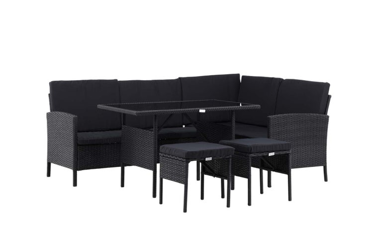 Das Knock Lounge-Set 4-teilig schwarz ist ein Lounge-Möbel in schwarzer Farbe, das sowohl Stil als auch Funktionalität in Ihr Zuhause bringt. Knock Lounge-Set 4-teilig schwarz. Ecksofa schwarz inkl. Kissen, inkl. Fußhocker, B x H x T cm: 145/135/73/56, Sitzhöhe cm: 34, Sitztiefe cm: 56. Tisch schwarz, B x H x T cm: 70/65/110. Dieses Produkt wurde mit viel Liebe zum Detail hergestellt, was sowohl Ästhetik als auch hohe Haltbarkeit gewährleistet. Bei der Gestaltung wurde sowohl auf Funktionalität als auch auf Stil geachtet, was es zur perfekten Wahl für jeden Raum in Ihrem Zuhause macht. Die verwendeten Materialien sind von hoher Qualität, was dem Produkt eine lange Lebensdauer verleiht und dafür sorgt, dass es dem täglichen Gebrauch standhält. Ob zur Aufbewahrung oder als dekorative Ergänzung, dieses Produkt wertet Ihre Einrichtung auf und bringt zusätzlichen Komfort und Eleganz in Ihr Zuhause.