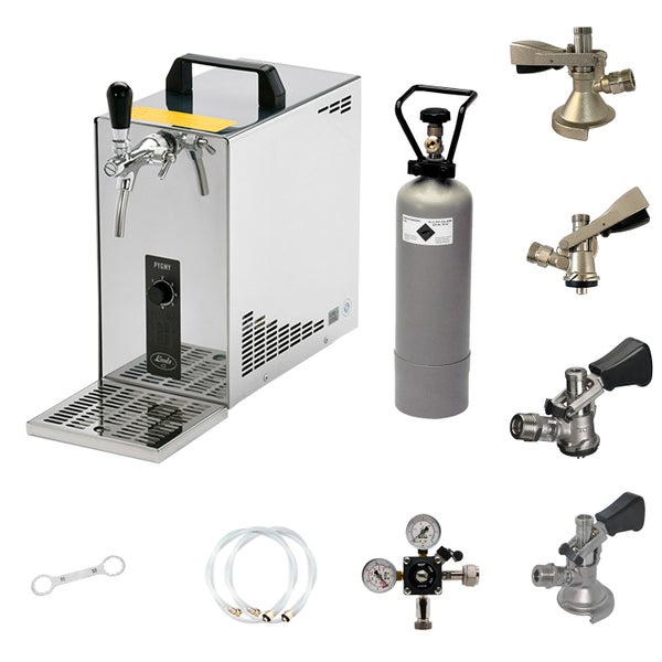 Komplett Set - Zapfanlage, Bierzapfanlage, Bierkoffer, Durchlaufkühler PYGMY 25 LE, 1-leitig Trockenkühler, 30 Liter/h, Set alle Zapfköpfe