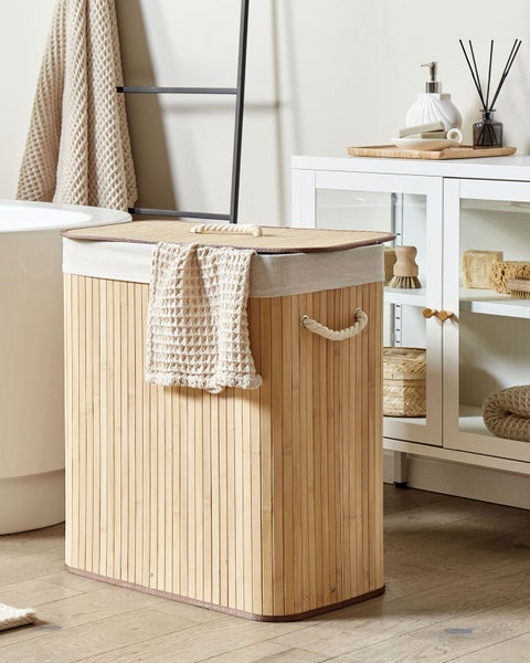 Moderner, handgefertigter Wäschekorb mit 2 Fächern, Deckel und Wäschesack. Dank dieser Wäschetonne schaffen Sie schnell Ordung in Ihrem Bade- und Schlafzimmer. Der hohe Wäschesammler verfügt über einen Stoffeinsatz mit 2 separaten Fächern, die Ihnen erlauben Ihre Wäsche besser zu sortieren. Zudem besitzt die Wäschebox einen praktischen Deckel, der für ein ordentliches Aussehen sorgt, den Holzkorb verschließt und somit geruchsneutral macht. Die zusätzlichen Transportgriffe machen es Ihnen auch möglich den Waschkorb an jeden beliebigen Ort zu befördern – so können Sie z. B. einen schnellen Rundgang machen und die Wäsche in jedem Raum einsammeln und bis an die Waschmaschine tragen. Details: Typ Wäschekörbe. Stil: Boho. Farbe: Heller Holzfarbton. Material: Holz. Material: Bambusholz. Zusätzliches Material: Polyester. Zusammenstellung: 30% Baumwolle. Form: Rechteckig. Handgefertigt: Ja. Abmessungen: Tiefe: 30 cm. Breite: 50 cm. Höhe: 60 cm. Gewicht: 2.3 kg. .Sie kaufen: 1 x Korb. Produktvorteile: Die natürliche Holzmaserung und Knoten machen jedes Stück zu einem Unikat, Hohe Qualität, Handgefertigte Präzision, Ausgestattet mit Tragegriffen, Multifunktional, Nimmt verschiedene Aufbewahrungsbedürfnisse auf. Montage: Benötigt keine Montage. Zusatzinformationen: Holz ist ein natürliches Material, daher bleibt die feine, natürliche Struktur und die ganz besondere Optik der Holzoberfläche trotz der Farbschicht erhalten. Da bei der Herstellung natürliche Materialien verwendet werden, können kleine Farb-, Form-, bzw. Größendifferenzen auftreten. Diese Unterschiede stellen jedoch keinen Produktfehler dar. Pflegeanleitung: Bambusholz: 1.Bitte ausschließlich milde Reinigungsmittel und weiche Tüchern verwenden. Dabei immer in Richtung der Maserung abwischen. 2.Feuchte Stellen sofort mit einem weichen Tuch trocken reiben und Dauernässe bei der Reinigung vermeiden. 3.Nur bei geölten Holzartikeln befolgen: Sie sollten nach einiger Zeit nachgeölt werden, damit sie lange in einem guten Zustand erhalten bleiben. Polyester: 1.Von Hand oder mit einem Feinwäsche-Programm bei max. 30°C waschen, wenn auf dem Etikett keine weiteren Hinweise des Herstellers gegeben sind. 2.Wenn auf dem Etikett nicht anders angegeben, bitte nicht im Trockner trocknen und auch nicht bügeln.