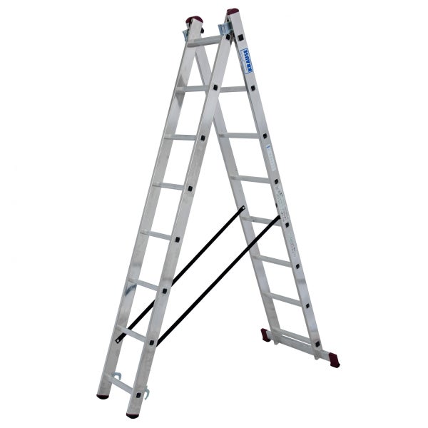 Zweiteilige Aluminium-Mehrzweckleiter mit praktischer Dreifachfunktion. Einsetzbar als Anlege-, Steh- und Schiebeleiter. Rundum profilierte Sprossen Stahl-Führungsprofile ermöglichen das komfortable Ausschieben der Leiter Quertraverse für einen sicheren Stand Rutschhemmende Fußstopfen Bis 150 kg belastbar