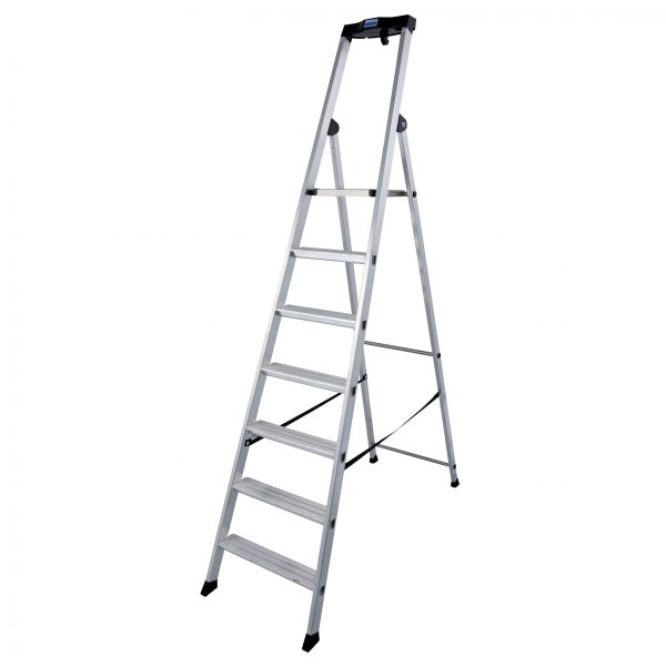 Stufen-StehLeiterSolido® Robuste Aluminium-Stehleiter für den universellen Einsatz Sicherheitsbügel mit integriertem Eimerhaken und Werkzeugaufnahme Hochfest verbördelte Stufen-/Holmverbindung Hightech-Gelenkverbindungen mit stabilem Stahlkern Extrem rutschsichere Alu-Sicherheitsplattform durch Gerstenkorn-Profilierung Große, rutschsichere, profilierte und bodenschonende Fußkappen