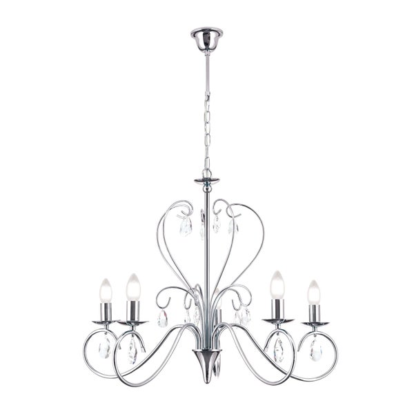 Der Luster ALESSIA 5 flammig Chrom kombiniert elegante Formen mit einem modernen Glanz. Geschwungene Ranken aus verchromtem Stahl tragen funkelnde Kristallanhänger aus hochwertigem Vollschliff Kristallglas. Die reflektierende Oberfläche der Montur und das glitzernde Kristall schaffen zusammen ein edles Lichtspiel. In Verbindung mit passenden E14 Leuchtmitteln entsteht eine stimmungsvolle Beleuchtung, die besonders in Esszimmern oder Wohnbereichen eine festliche und einladende Atmosphäre erzeugt.