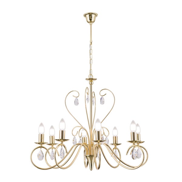 Der Luster ALESSIA 8 flammig Gold vereint elegante Verspieltheit mit luxuriöser Ausstrahlung. Geschwungene Ranken aus vergoldetem Stahl tragen hochwertige Kristallanhänger, die das Licht in funkelnde Reflexe verwandeln. Die klare Formensprache kombiniert mit den glitzernden Kristallen verleiht jedem Raum einen Hauch von Glamour. In Kombination mit passenden E14 Leuchtmitteln entsteht ein stimmungsvolles, blendfreies Lichtbild, das besonders über Esstischen oder in Wohnbereichen eine festliche Atmosphäre schafft.