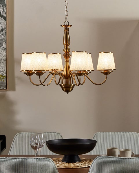 Elegante, sechsflammige Hängeleuchte im Vintage-Stil. Angenehmer und weicher Lichtschein und stilvolle Beleuchtung. Auf den sechs geschwungenen Armen des eleganten Kronleuchters sind runde Lampenschirme aus weißem Acryl befestigt. Das verchromte Metall bildet einen wunderschönen Kontrast zu den zierlichen Lampenschirmen und verleiht dem Leuchter ein luxuriöses Erscheinungsbild. Die klassische Lampenkette verstärkt das Vintage Flair dieser traumhaft schönen Lampe. Details: Typ Pendelleuchten. Stil: Klassisch. Farbe: Messing. Material: Metall. Material: Eisen. Zusätzliches Material: Acryl. Material Lampenschirm: Acryl. Fassung: Max. 40 W. Finish: Verchromt. Schutzklasse: IP 20. Anzahl der Glühbirnen: 6. Spannung 230 V (50 Hz). Abmessungen: Kabellänge: 160 cm. Tiefe: 65 cm. Breite: 65 cm. Höhe: 127 cm. Gewicht: 3 kg. .Sie kaufen: 1 x Hängeleuchte, Nicht im Lieferumfang enthalten: Leuchtmittel. Produktvorteile: Ruhespendendes Licht, Sorgt für eine gleichmäßige Beleuchtung des Raumes, Elegante Optik, Qualitativ hochwertiges Material, Optimale Energieeffizienz, Besonders pflegeleicht. Montage: Erfordert Installation und Montage.20 - 40 Min. Zusatzinformationen: Diese Leuchte ist geeignet für Leuchtmittel der Energieklassen A bis G auf einer Skala von A (sehr effizient) bis G (weniger effizient). Geeignet für: LED Leuchtmittel, Eco-Halogen Leuchtmittel, Energiesparleuchtmittel. Die Stromkabel dürfen nur von einem qualifizierten Elektriker angepasst werden. Pflegeanleitung: Metall: 1.Bitte ausschließlich handelsübliche, milde Reinigungsmittel und weiche Tücher verwenden, wobei feuchte Stellen sofort trocken gerieben werden sollten. 2.Vermeiden Sie scheuernde Reiniger, da diese die Oberfläche beschädigen können. 3.Bei Chrom und Kupfer regelmäßig mit speziellen Pflegemitteln polieren. Acryl: 1.Bitte ausschließlich milde Reinigungsmittel und weiche Tücher verwenden. Feuchte Stellen sofort trocken reiben.