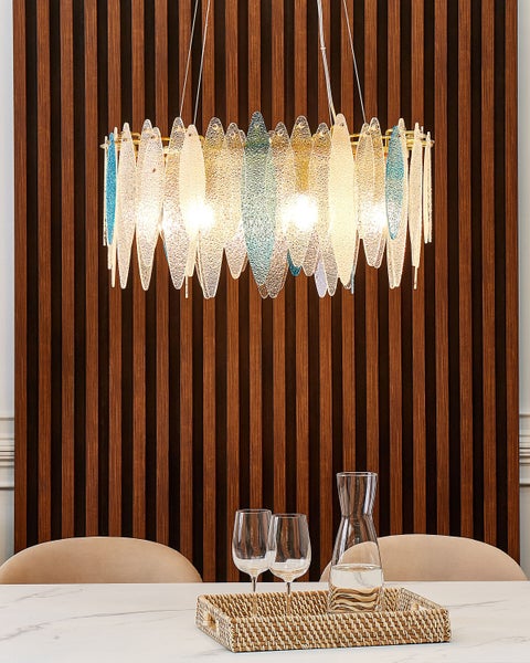 Moderner, runder Glas-Kronleuchter in Wasserfalloptik. Bringen Sie diese Schönheit in Ihre Wohnbereiche und profitieren Sie sowohl von der luxuriösen Ausstrahlung als auch von den pflegeleichten und langlebigen Materialien dieses Modells. Dieser Lüster besteht aus einem Eisenring mit passenden Haken, die in einem edlen Goldton gehalten und mit ovalen Glasscheiben umgeben sind. Die gläsernen Elemente verfügen über eine porenartige Strukturierung, die vor allem, dann zum Vorschein kommt, wenn der Kronleuchter eingeschaltet ist. Dank dieser weißen und blauen Glasteile ist er nicht nur ein Hingucker, er strahlt auch eine fesselnde Wärme aus, die perfekt zu glamourösen Interieurs passt und für einen einladenden Look sorgt. Details: Typ Kronleuchter. Farbe: Bunt. Material: Glas. Material: Glas. Zusätzliches Material: Eisen. Material Lampenfuss: Eisen. Material Lampenschirm: Glas. Fassung: Max. 40 W. Finish: E-Coating. Schutzklasse: IP 20. Anzahl der Glühbirnen: 8. Spannung 230 V (50 Hz). Abmessungen: Fuß: 12x12x3. Kabellänge: 100 cm. Tiefe: 60 cm. Breite: 60 cm. Höhe: 120 cm. Gewicht: 4 kg. .Sie kaufen: 1 x Hängeleuchte, Nicht im Lieferumfang enthalten: Leuchtmittel. Produktvorteile: Sorgt für eine gleichmäßige Beleuchtung des Raumes, Schnelle und leichte Montage, Modernes Design, Perfekte Ergänzung für Ihr Heim und für jeden Einrichtungsstil, Hohe Qualität. Montage: Erfordert Installation und Montage.20 - 40 Min. Zusatzinformationen: Diese Leuchte ist geeignet für Leuchtmittel der Energieklassen A bis G auf einer Skala von A (sehr effizient) bis G (weniger effizient). Geeignet für: LED Leuchtmittel, Eco-Halogen Leuchtmittel, Energiesparleuchtmittel. Die Lampe besitzt keinen eigenen Ein/Ausschalter und benötigt daher einen separaten Schalter an der Wand, Die Stromkabel dürfen nur von einem qualifizierten Elektriker angepasst werden. Pflegeanleitung: Glas: 1.Bitte ausschließlich milde Reinigungsmittel bzw. Glasreiniger und weiche Tücher verwenden. Feuchte Stellen mit einem weichen Tuch trocken reiben. 2.Keine scheuernden Reinigungsmittel nutzen, da diese die Oberfläche beschädigen können. Eisen: 1.Bitte ausschließlich handelsübliche, milde Reinigungsmittel und weiche Tücher verwenden, wobei feuchte Stellen sofort trocken gerieben werden sollten. 2.Vermeiden Sie scheuernde Reiniger, da diese die Oberfläche beschädigen können. 3.Bei Chrom und Kupfer regelmäßig mit speziellen Pflegemitteln polieren.