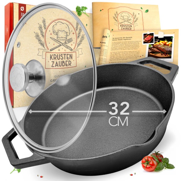 KRUSTENZAUBER 32cm Gusseisenpfanne Induktion - Voreingebrannte Gusseisen Pfanne - Ideale Grillpfanne Induktion, Eisenpfanne, Cast Iron Pan, Bratpfanne, Gusseiserne Pfanne Skillet Gusspfanne