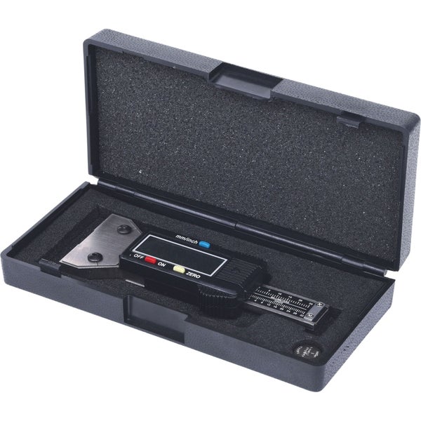 nach DIN 862 mit Feststellschraube für Tiefenmessungen mm/Zoll Umschaltung Reset (Nullsetzen) an jeder Position möglich große LCD-Anzeige - Ziffernhöhe 8,0 mm mit automatischer Abschaltung ganz gehärtet und feinst bearbeitet rostfreier Stahl in stabilem Kunststoffetui