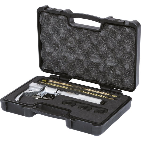 zum Nachschneiden und Reinigen von Innen- und Außengewinden für Rechts- und Linksgewinde bis Ø 140mm geeignet schnelle Umrüstung durch Schneidbackenwechsel möglich keine Beschädigung des Gewindes durch weiche Halte- und Führungsbacke mit 3 x Schneidmutter für LKW-Radbolzen-Gewinde Spezial-Werkzeugstahl in stabilem Kunststoffkoffer Strehler metrisch: 1,0-1,25-1,5,-1,75-2,0-2,5-3,0-3,5 mm Strehler Zoll: 24-20-18-16-14-12-11,5-11-10-9-8-7,5-7-6-5-4 Gänge Gewindefeile metrisch: 0,8-1,0-1,25-1,5-1,75-2,0-2,5-3,0 mm Gewindefeile Zoll: 24-20-18-16-14-12 -11-10 Schneidmutter: M18x1,5 / M20x1,5 / M22x1,5 Anwendungen: NFZ, Landtechnik, Baumaschinen, Kommunal- und Forsttechnik etc. an z.B. Achsgewinde, Hydraulikzylinderverschraubungen, Lenk- und Schubstangen