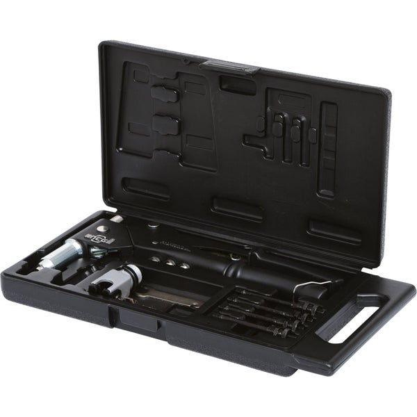 geeignet für Blindnieten, Blindnietmuttern und Hohlraum-Metalldübel 360° drehbarer Kopf für schwer zugängliche Bereiche mit vier auswechselbaren Mundstücken und Nutmutternzugdorne Körper aus MetalldruckgussMerkmale Form: 45° gewinkelt Funktion: stufenlos verstellbar Maul: S-förmiges Blindnieten: 2,4 - 3,2 - 4,0 - 4,8 mm Nietmuttern: M3 - M4 - M5 - M6 Hohlraum-Metalldübel: 3,0 - 6,0 mm