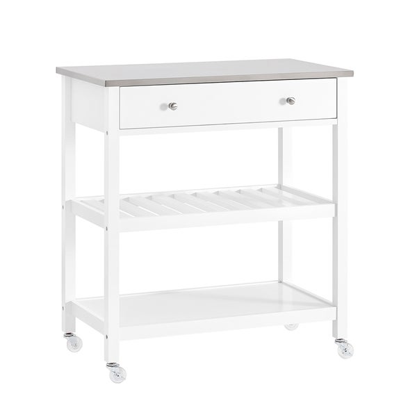 Material: MDF E1, Kiefernholz, Edelstahl Robuste Konstruktion Massive Kiefernholzbeine und eine Edelstahlplatte verleihen diesem Küchenwagen mit Rollen hohe Stabilität und Langlebigkeit. Er eignet sich optimal als Kücheninsel, Vorratsschrank oder Barwagen. Praktische Aufteilung Mit einer tiefen Schublade (68×28×10 cm) und zwei offenen Regalen bietet das Möbelstück viel Stauraum für Utensilien, Flaschen oder Geschirr. Ideal als Küchenkommode oder ergänzender Küchenschrank. Bewegliche Lösung 4 Lenkrollen – davon 2 mit Bremse – ermöglicht ein sicheres und leichtes Bewegen. Perfekt einsetzbar als Teewagen, Barschrank oder platzsparender Eingangsbegleiter. Stilvolles Design Die moderne weiße Optik und kompakte Bauweise passen hervorragend in kleine Küchen, Wohnbereiche oder Gärten. Ein vielseitiges Möbel als Küchenbuffet, Anrichte oder modulares Ergänzungsstück.