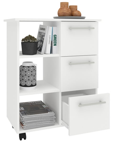 Praktischer und geräumiger Küchenwagen für zusätzlichen Stauraum in der Küche. Drei Schubladen und drei offene Fächer lassen den mobilen Servierwagen zum Stauraumwunder werden.