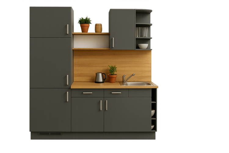 Küchenzeile 190 cm Anthrazit – GEBA - vormontiert mit E-Geräten, Nischenrückwand & Müllsystem