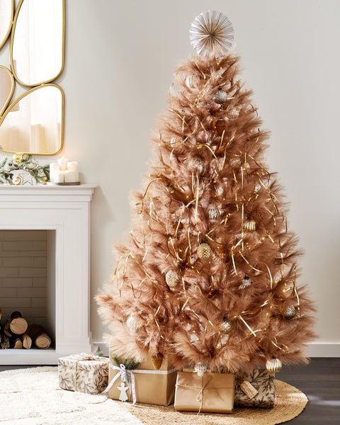 Kunstweihnachtsbaum mit passendem Ständer. Mit dieser originellen Dekotanne werden Sie selbst zum Weihnachts-Trendsetter. Dieser Kunstbaum zeichnet sich nicht nur mit seiner anziehenden, nahezu herbstlichen Farbgestaltung, sondern auch mit seinem luftigen Look aus. Seine biegbaren Zweige erlauben es Ihnen, die fluffige, federähnliche Optik des Kunstbaums leicht an Ihre Wünsche anzupassen. Zudem verfügt er über einen stabilen Standfuß mit einer passenden Klemmvorrichtung, die den Baum festhält. Ob Sie ihn nun mit schlichtem Weihnachtsschmuck bestücken oder einfach seine natürliche Schönheit genießen wollen, er wird auf jeden Fall ein Hingucker in Ihren Wohnräumen sein. Details: Typ Weihnachtsbaum. Farbe: Braun. Farbton: Hellbraun. Material: Stoff. Material: Stoff. Zusätzliches Material: Stahl. Handgefertigt: Nein. Abmessungen: Tiefe: 115 cm. Breite: 115 cm. Höhe: 180 cm. Gewicht: 8 kg. .Sie kaufen: 1 x Weihnachtsbaum, 1 x Ständer. Produktvorteile: Die Zweige lassen sich einfach in Form biegen, Erzeugt Wohlfühlcharakter in jedem Raum, Passt ausgezeichnet zu vielen Einrichtungsstilen, Nur für Innenräume geeignet, Pflegeleichtes und strapazierfähiges Material. Montage: Teilweise montiert.5 - 15 Min. Pflegeanleitung: Stoff: Aufliegender Staub sollte sanft mit einem Staubwedel entfernt werden.