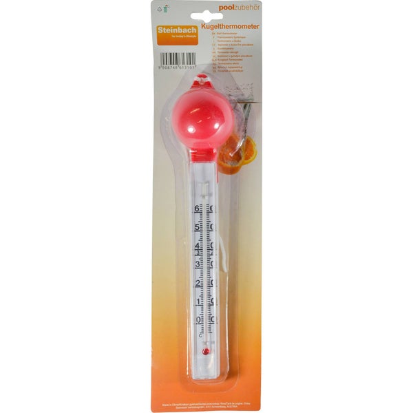 Schwimmendes Poolthermometer mit rotem Kugelkopf. Anzeige in °C.