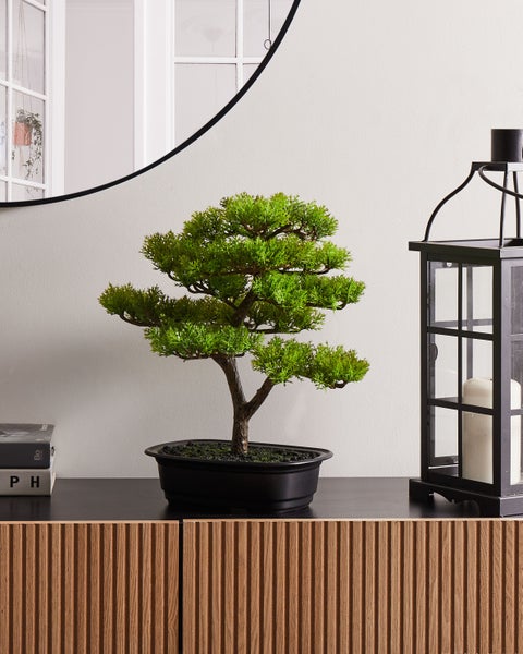 Künstlicher Bonsai-Baum. Dieser künstliche Bonsai-Baum bringt Frieden und Harmonie ins Haus. Er ist in einer naturnahen Optik gefertigt und sieht in jedem modernen Wohnraum fabelhaft aus und verleiht ihm einen Hauch von organischem Charme. Für alle, die sich schon immer einen Bonsai gewünscht haben, aber keinen echten halten konnten, ist diese künstliche Schönheit das perfekte Akzentstück. Details: Typ Kunstpflanze. Farbe: Grün. Material: Kunststoff. Material: Kunststoff. Zusätzliches Material: Zement. Handgefertigt: Nein. Abmessungen: Tiefe: 20 cm. Breite: 32 cm. Höhe: 37 cm. Gewicht: 1.3 kg. .Sie kaufen: 1 x Kunstpflanze. Produktvorteile: Die Zweige lassen sich flexibel in Form biegen, Ein einzigartiger Hingucker, Passt wunderbar zu jedem Einrichtungsstil, Gemütliche Ausstrahlung, Pflegeleichtes und strapazierfähiges Material. Montage: Benötigt keine Montage. Pflegeanleitung: Kunststoff: 1.Bitte ausschließlich milde Reinigungsmittel und weiche Tücher verwenden. Feuchte Stellen sofort trocken reiben.