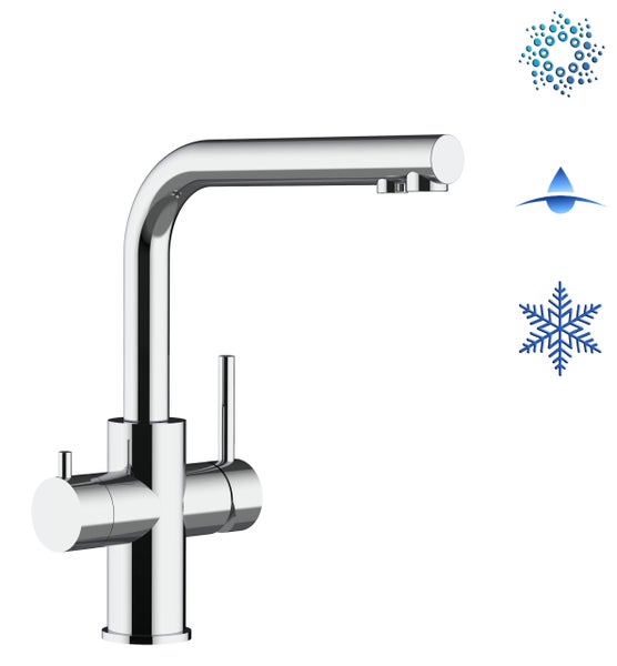 5-Wege-Wasserhahn Küchenarmatur Spültischmischer, massiv aus Chirurgen-Edelstahl, mit 360° schwenkbarem Auslauf - für alle Kombi-Kühl-, Filter- und Sprudelwassergeräte. Mit separater Multi-Selection-Keramik-Mischpatrone am Hahn und separatem Kanal für die gefilterte Wasserentnahme.