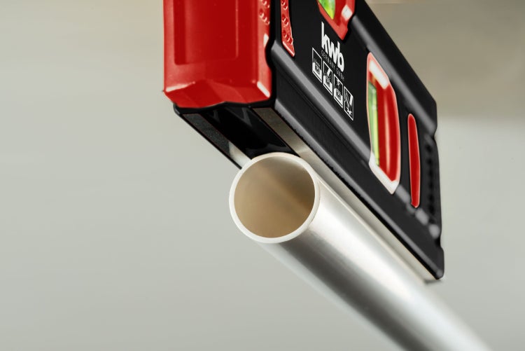 - Die Leichtmetall-Wasserwaage verfügt über je 1 Libelle für horizontale Messungen und für die vertikale Messung.