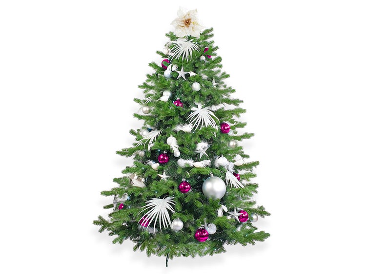 Sie erhalten das Set aus Ornamenten und Dekorationen in einer Box, bereit zum Schmücken, der Baum wird in einer Versandbox geliefert.