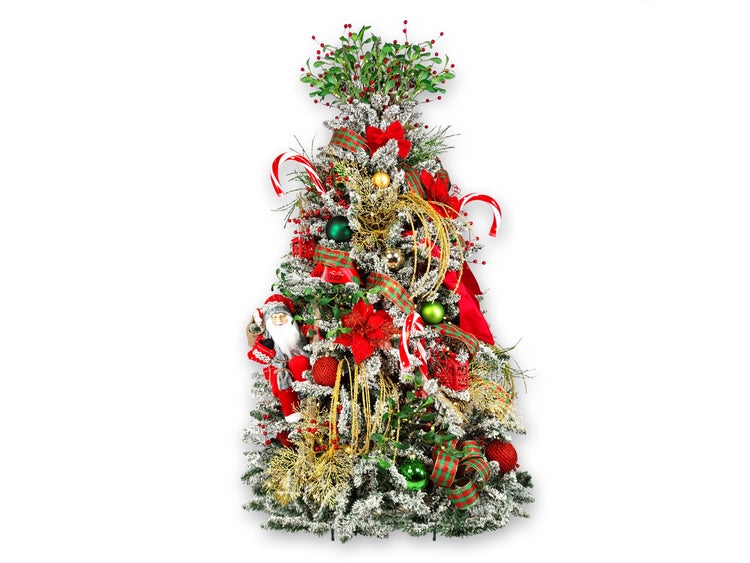 Der Baum wird von den traditionellen Weihnachtsfarben Rot, Grün und Gold dominiert, die eine unverwechselbare Atmosphäre der Freude schaffen.