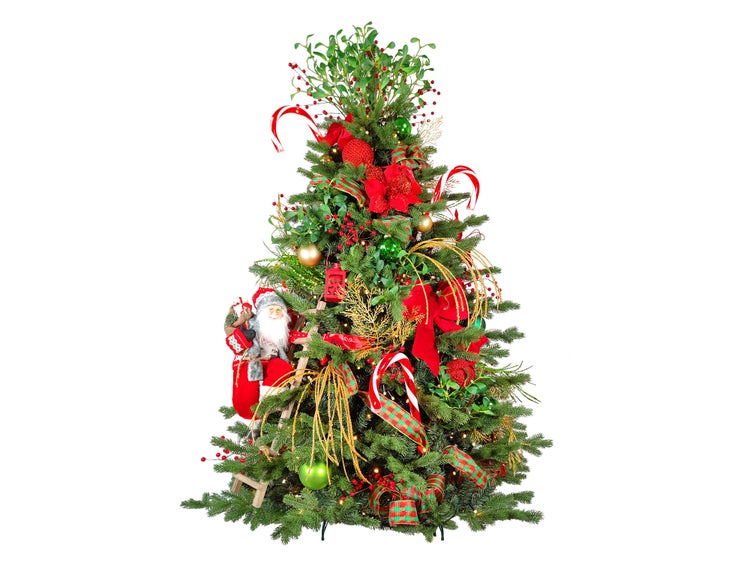 Der Baum wird von den traditionellen Weihnachtsfarben - Rot, Grün und Gold - dominiert, die eine unverwechselbare Atmosphäre der Freude schaffen.