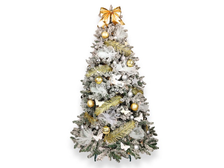 Schmetterlinge in sanften Tönenund goldene Ornamente mit Dekor verleihen dem Baum eine unwiderstehliche Note.
