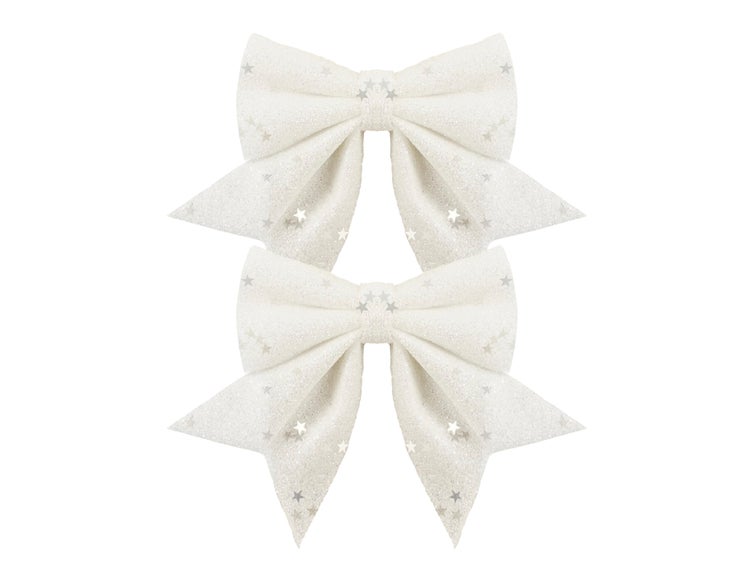 Dieses Set enthält 2 Stück weiße Schleifen mit Glitzer, die Ihrer Weihnachtsdekoration Glanz und Eleganz verleihen.