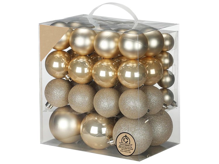 Set mit 54 runden Ornamenten in Champagnerfarbe.