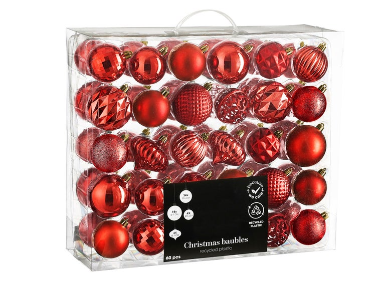 Set mit 60 roten Kunststoff-Ornamenten in glänzender, matter und verzierter Ausführung.