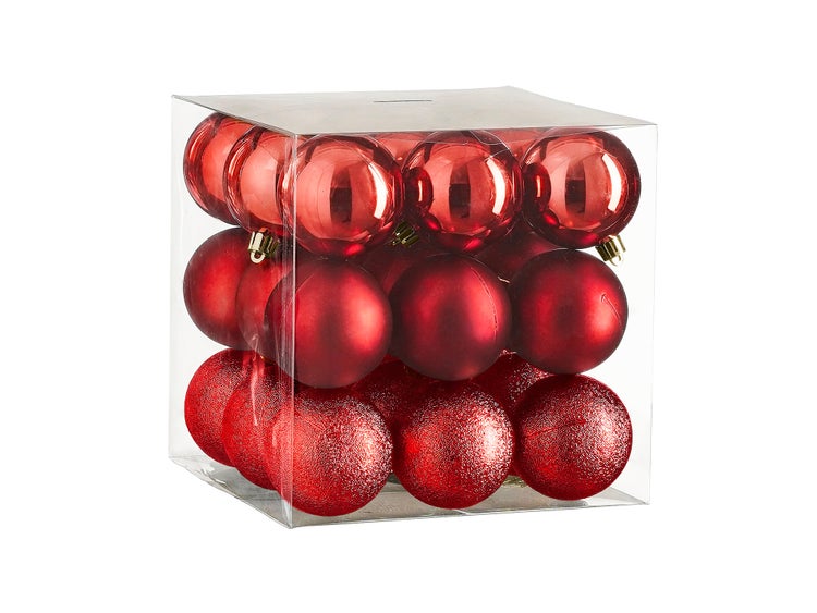 Ein Set mit 27 Kunststoffornamenten in traditionellem Rot in glänzender, matter und dekorativer Ausführung.
