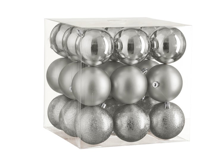 Ein Set mit 27 silbernen Kunststoffornamenten in glänzender, matter und verzierter Ausführung.