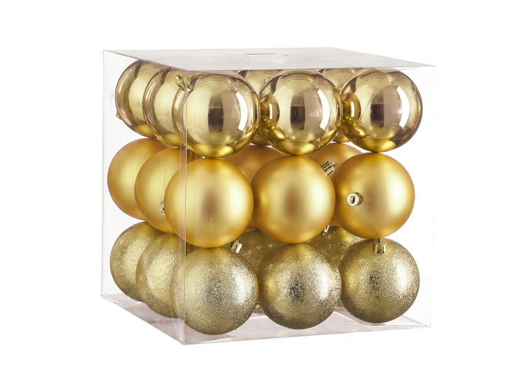 Ein Set mit 27 goldfarbenen Kunststoffornamenten in glänzender, matter und verzierter Ausführung.