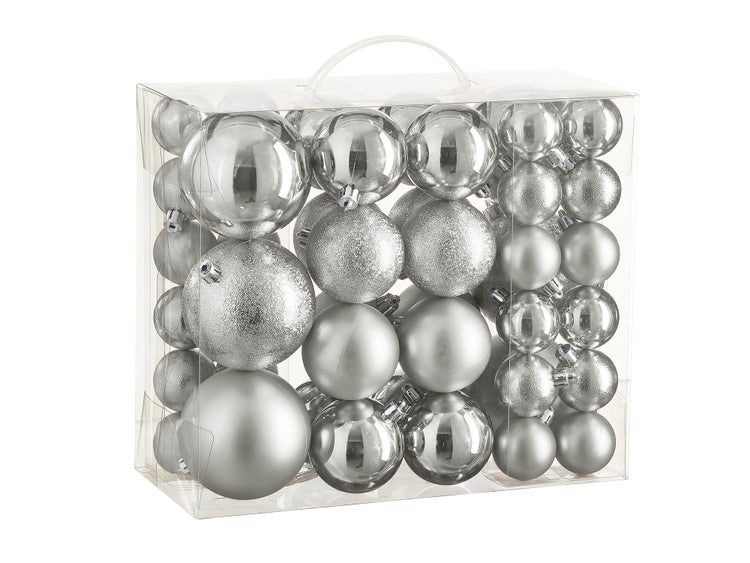 Ein Set mit 46 Kunststoffornamenten in kühlem Silber in glänzender, matter und verzierter Ausführung.