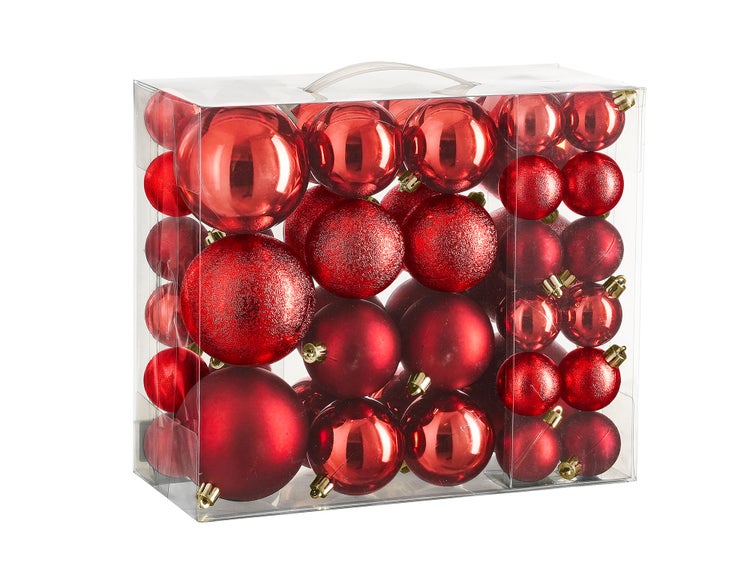 Ein Set mit 46 roten Kunststoffornamenten in glänzender, matter und verzierter Ausführung.