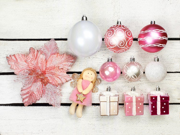 Die Ornamente in Form von Geschenken und Blumen in Rosatönen sorgen für den richtigen Touch.