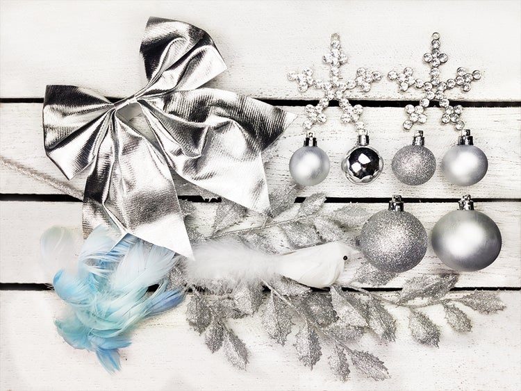 Perfekt aufeinander abgestimmte Ornamente und Dekorationen in Silber, ergänzt durch zarte Federn.