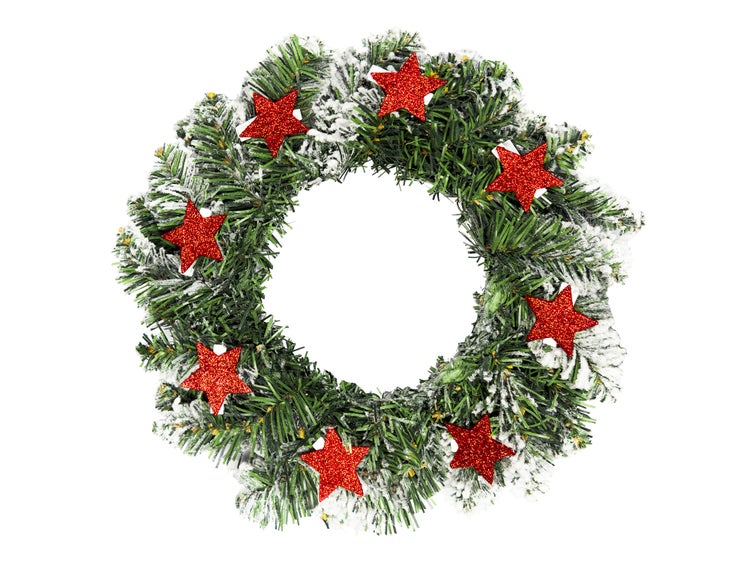 Der Kranz ist mit funkelnden roten Sternen verziert, die der Dekoration eine lebendige und festliche Note verleihen.