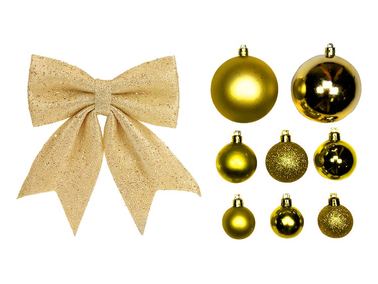 Das Schmuckset GOLDEN CHRISTMAS ist die ideale Wahl für alle, die eine schlichte und elegante Weihnachtsdekoration lieben. Es verbindet Minimalismus mit einer schönen goldenen Farbe, die ein Gefühl von Luxus und festlicher Atmosphäre in den Innenraum bringt. Es enthält eine Mischung aus goldenen Ornamenten in den Größen 4 - 15 cm und auch eine solide Stoffschleife mit Glitter, die ideal für die Dekoration der Baumspitze ist.