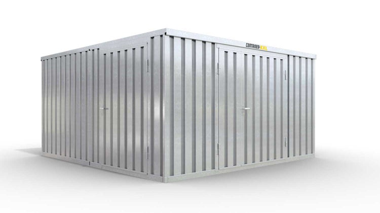 Lagercontainer Gerätehaus L2 – 16 qm, H2115 x B4050 x T4340 mm, verzinkt, ohne Fußboden, 1830 mm Doppelflügeltür mittig in Stirnseite und 1270 mm Einflügeltür mittig in Modul C, zerlegt