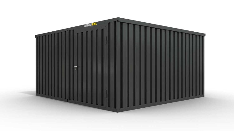 Lagercontainer Gerätehaus L2 – 16 qm, H2150 x B4050 x T4340 mm, Außenwandlackierung anthrazit, Dach außen verzinkt, mit Holzfußboden, 1270 mm Einflügeltür mittig in Modul D, montiert