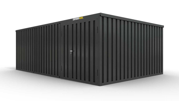 Lagercontainer Gerätehaus L3 – 25 qm, H2150 x B4050 x T6520 mm, Außenwandlackierung anthrazit, Dach außen verzinkt, mit Holzfußboden, 1830 mm Doppelflügeltür mittig in Modul D, montiert