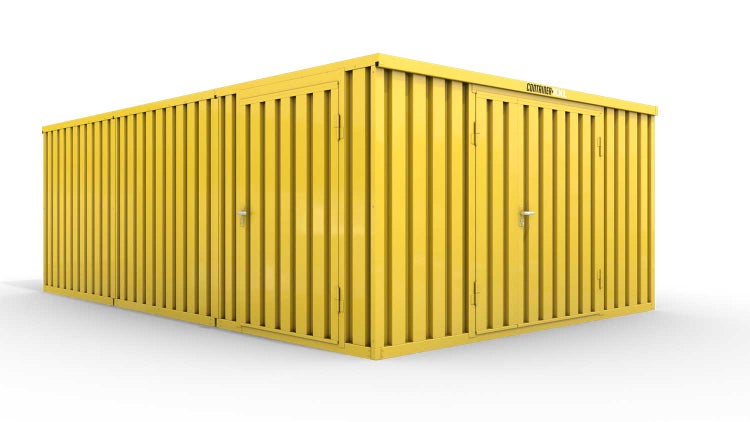 Lagercontainer Gerätehaus L3 – 25 qm, H2150 x B4050 x T6520 mm, Außenwandlackierung RAL 1003 signalgelb, Dach außen verzinkt, mit Holzfußboden, 1830 mm Doppelflügeltür mittig in Stirnseite und 1270 mm Einflügeltür mittig in Modul C, montiert
