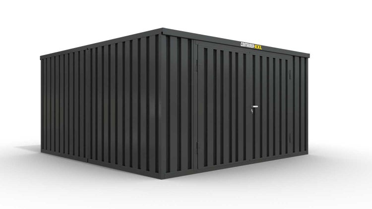Lagercontainer Gerätehaus M2 – 12 qm, H2150 x B3050 x T4340 mm, Außenwandlackierung anthrazit, Dach außen verzinkt, mit Holzfußboden, 2750 mm Doppelflügeltür mittig in Stirnseite, montiert