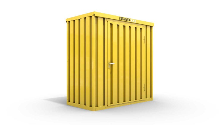 Lagercontainer Gerätehaus S – 4 qm, H2150 x B2100 x T2170 mm, Außenwandlackierung RAL 1003 signalgelb, Dach außen verzinkt, mit Holzfußboden, 1270 mm Einflügeltür mittig in Breitseite, montiert