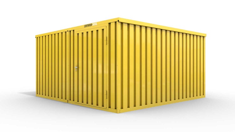 Lagercontainer Gerätehaus XL2 – 21 qm, H2150 x B5080 x T4340 mm, Außenwandlackierung RAL 1003 signalgelb, Dach außen verzinkt, mit Holzfußboden, 1270 mm Einflügeltür mittig in Modul D, montiert
