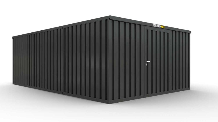 Lagercontainer Gerätehaus XL3 – 32 qm, H2150 x B5080 x T6520 mm, Außenwandlackierung anthrazit, Dach außen verzinkt, mit Holzfußboden, 1270 mm Einflügeltür mittig in Breitseite, montiert