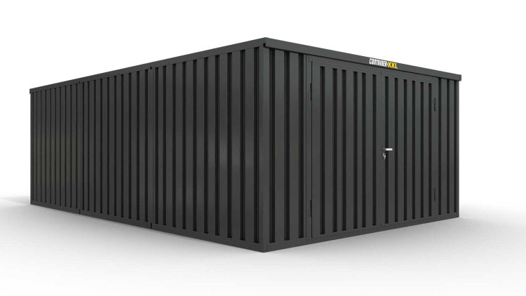 Lagercontainer Gerätehaus XL3 – 32 qm, H2150 x B5080 x T6520 mm, Außenwandlackierung anthrazit, Dach außen verzinkt, mit Holzfußboden, 2750 mm Doppelflügeltür mittig in Stirnseite, montiert