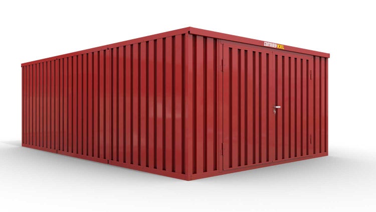 Lagercontainer Gerätehaus XL3 – 32 qm, H2150 x B5080 x T6520 mm, Außenwandlackierung RAL 3000 feuerrot, Dach außen verzinkt, mit Holzfußboden, 2750 mm Doppelflügeltür mittig in Stirnseite, montiert